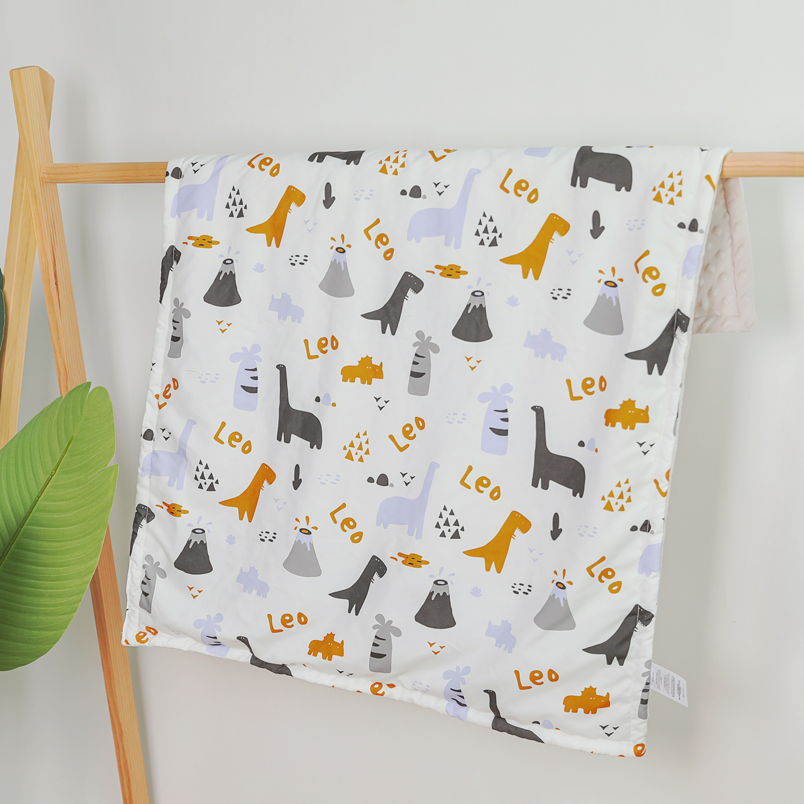 A gorgeous personalized baby blanket in a pretty Dinosaur with baby's name all over. A super cute baby blanket with animals print featuring dinosaurs. Personalized with baby's name all over.